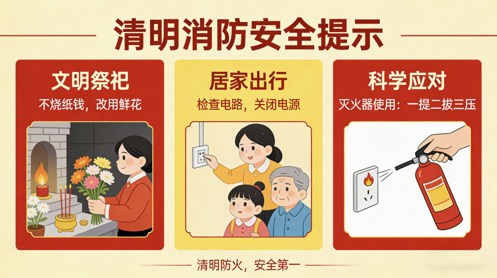 消防安全,人人有责。请广大群众自觉遵守消防法律法规,文明祭祀、安全出行,共同守护平安清明。