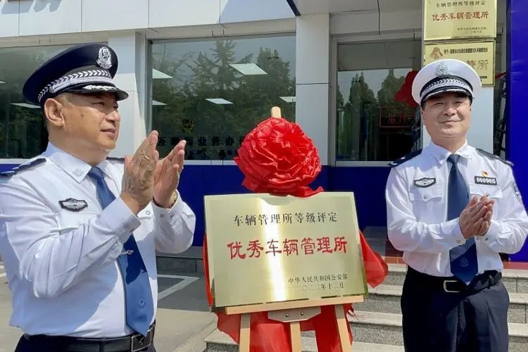 淄博市副市长、市公安局党委书记、局长刘启明,山东省公安厅车管所所长、警务技术一级主任贾兴无,共同为“全国优秀车辆管理所”揭牌。