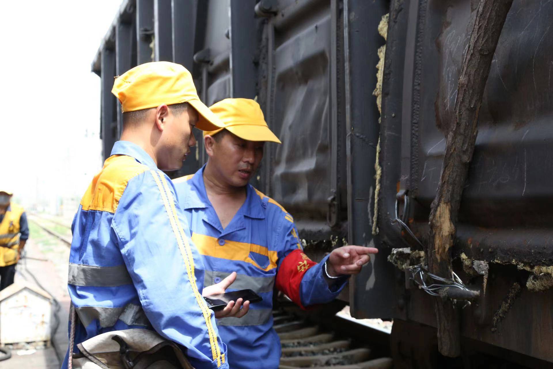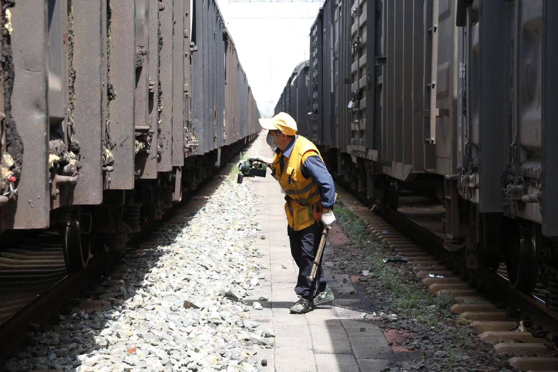 接近正午气温直逼39℃,烈日的炙烤下,车皮、钢轨被晒得滚烫,不断向外散发着滚滚的热浪,两旁的车列围得像条“铁胡同”,闷热的空气让人感觉呼吸不畅,路安强和拉风员张翔在间距不到4米的车列间穿行,就像是走在一个大烤箱里。