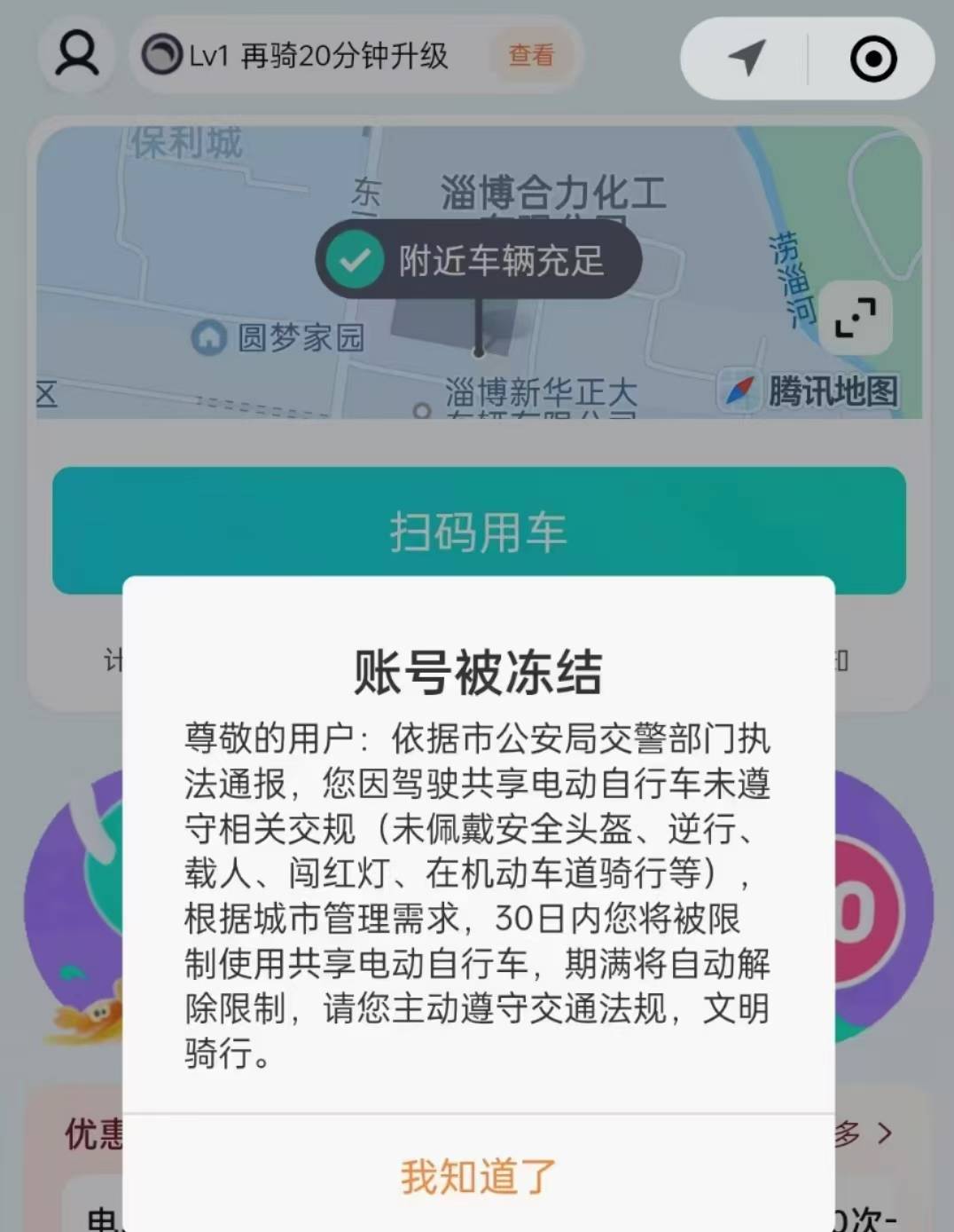 自7月1日起,因未按规定佩戴安全头盔、闯红灯、逆行、违法载人等交通违法行为被公安交警在执勤执法中现场查纠的驾驶人开始被限制使用共享单车。第一次违法被查处的限制使用1个月,第二次限制使用2个月,第三次限制使用1年。近期,淄博公安交警已向14家企业抄送涉及1334名违法驾驶人的《骑行共享电单车未佩戴安全头盔交通违法信息告知函》,并曝光不佩戴安全头盔共享电动车骑行驾驶人违法行为。共享单车企业收到告知函后及时落实违法骑行人员定期限制使用措施,用户扫码用车时,会出现“账号被冻结,30日内被限制使用共享电动车,期满自动解除限制”的提醒,因骑行共享电动车违法被处罚的驾驶人在全市范围内被限制使用1个月。