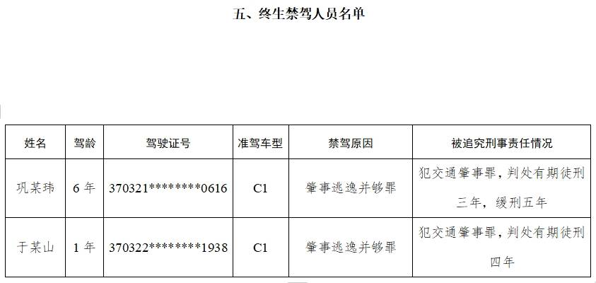 五、2名终生禁驾人员,巩某玮因肇事逃逸并够罪判处有期徒刑三年,缓刑五年;于某山因肇事逃逸并够罪判处有期徒刑四年。