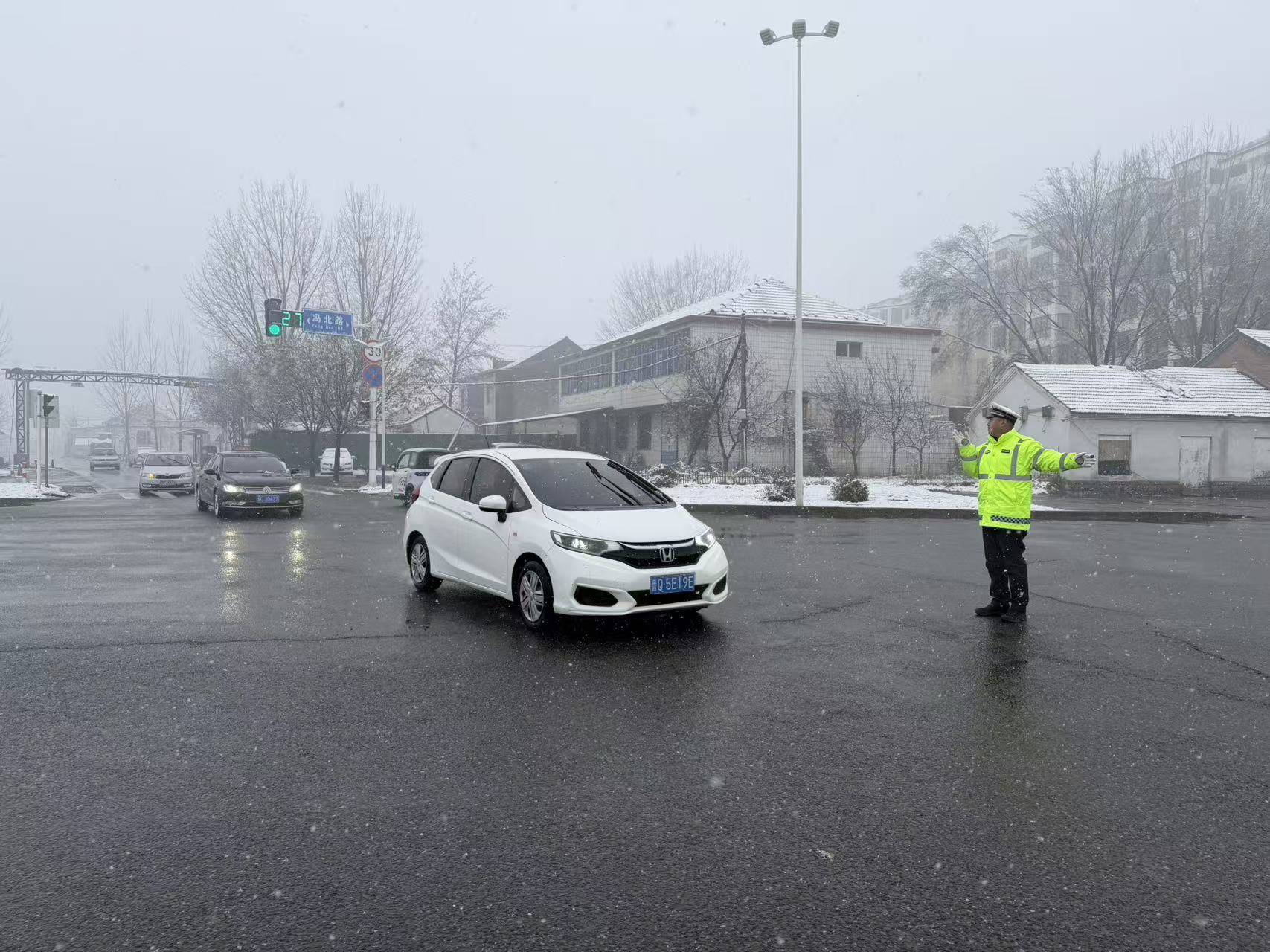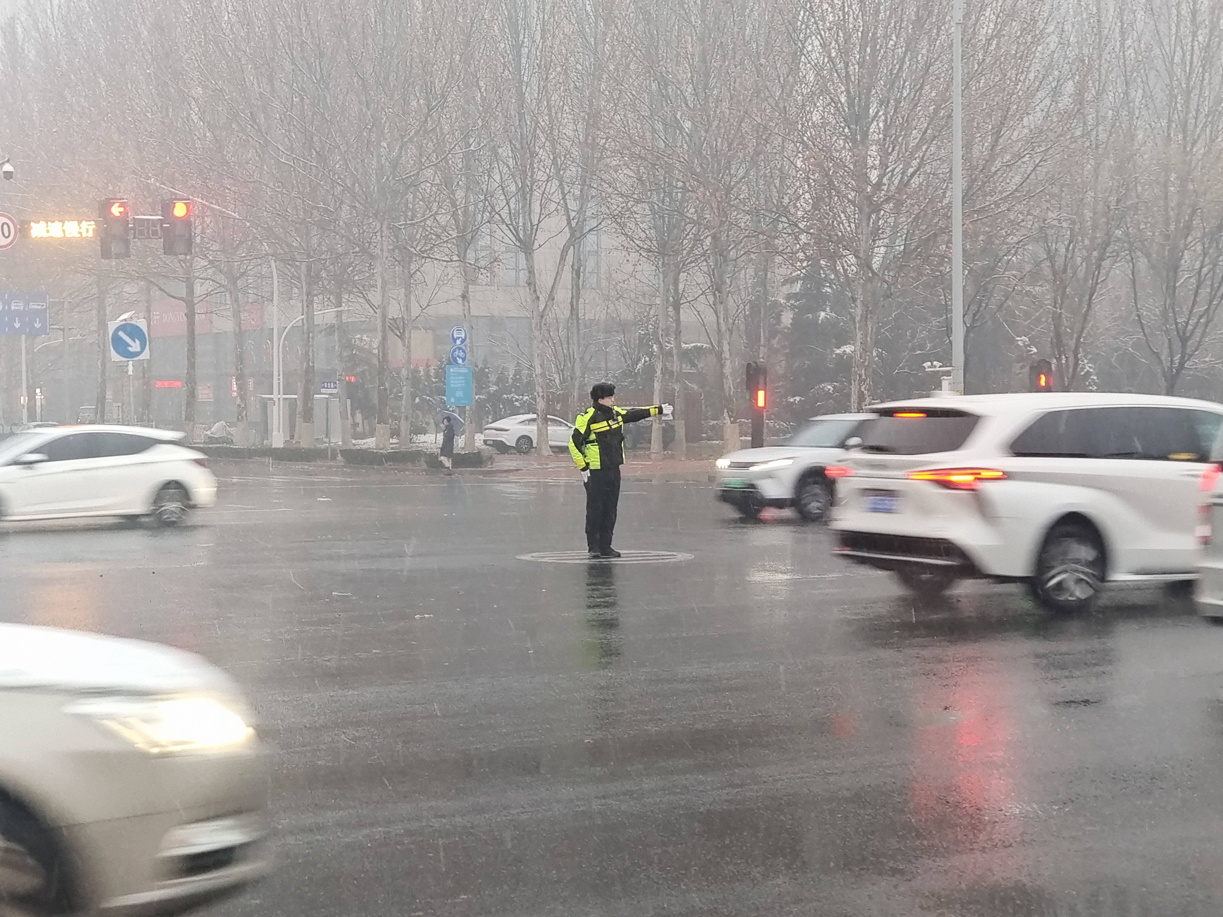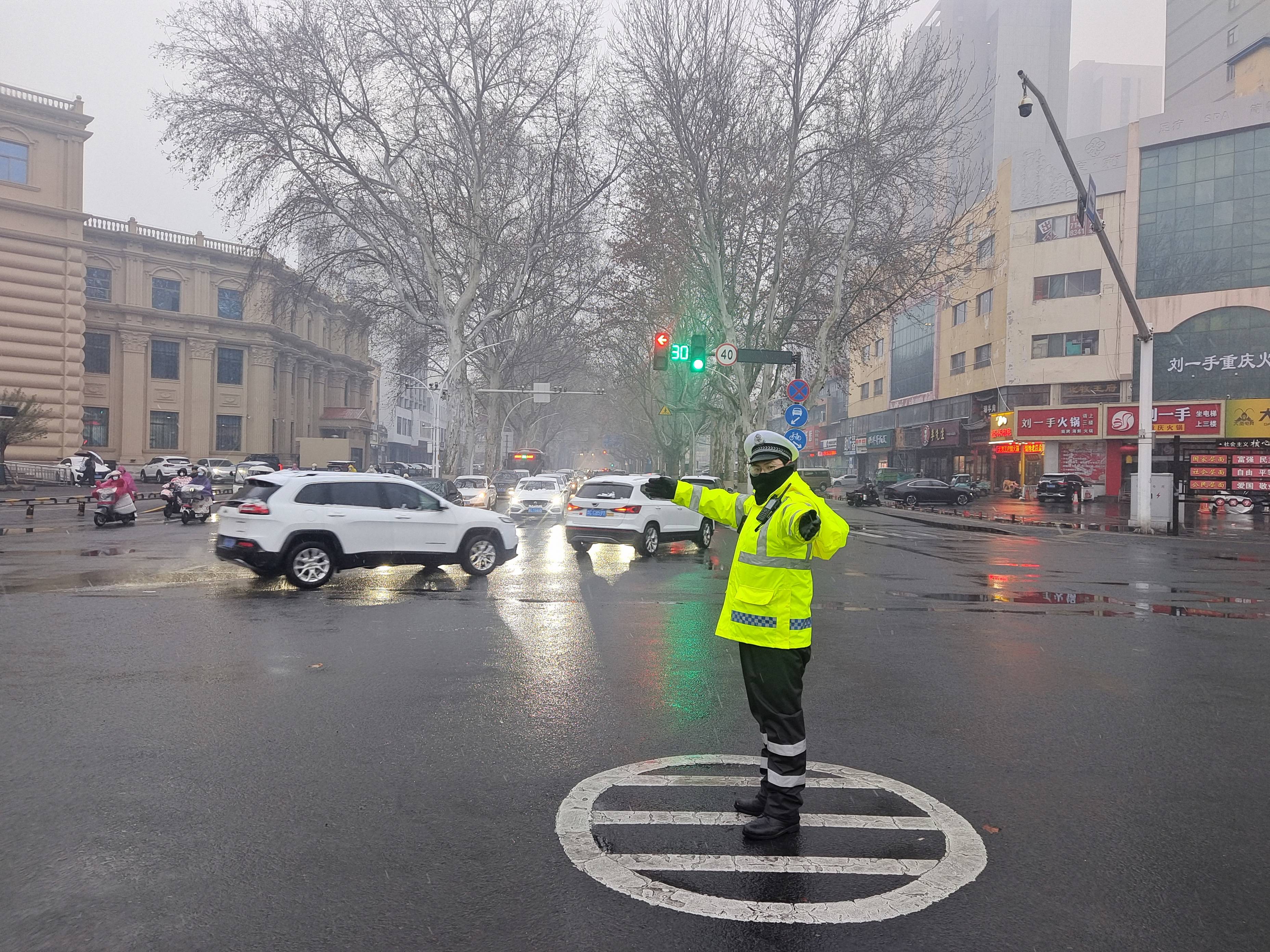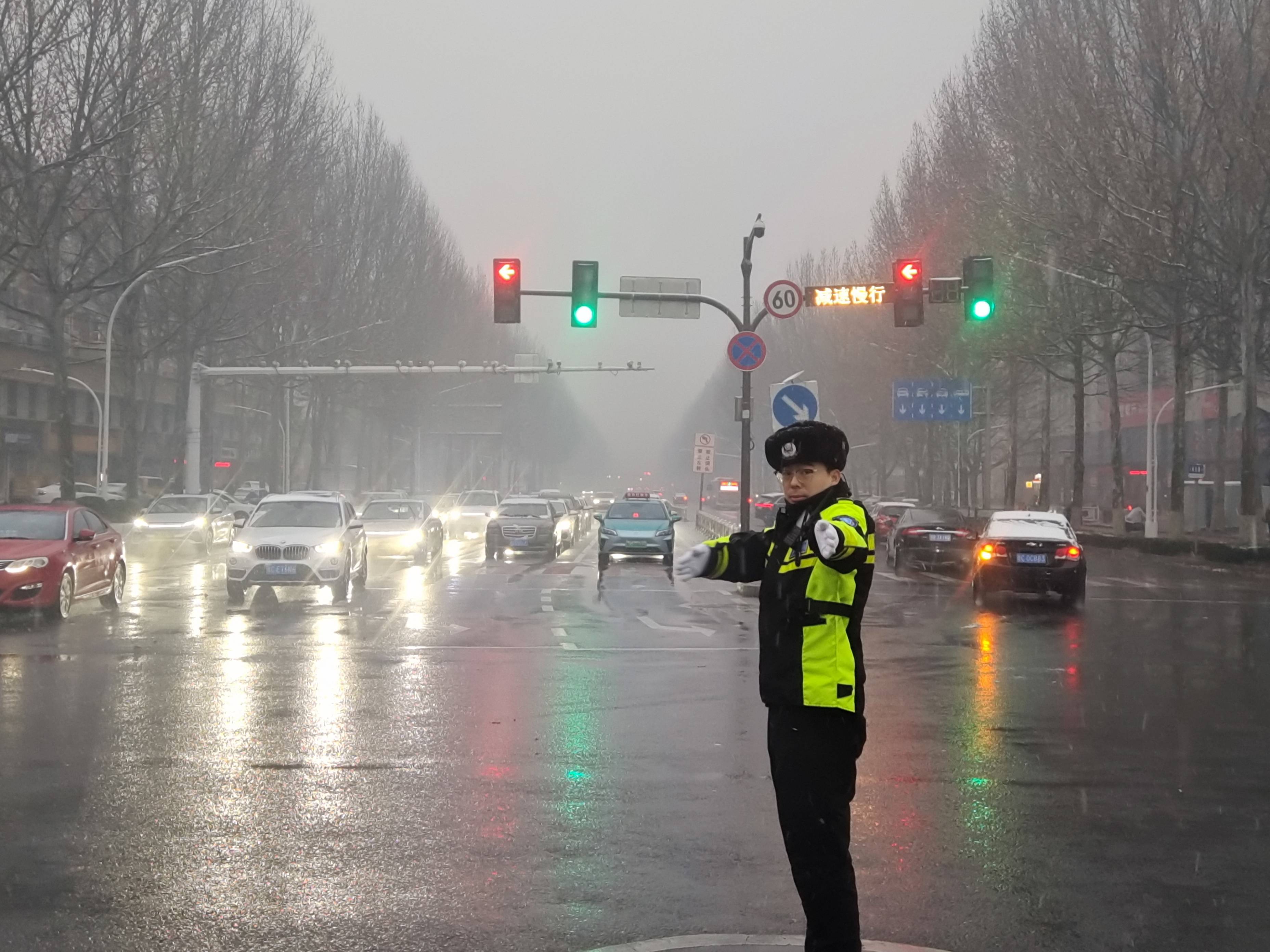 执勤民辅警顶风冒雪,在城区主干道、重点路口定岗值守、巡逻管控,通过手势指挥、警车喊话、警示提示等方式,引导车辆减速慢行、控距亮尾,及时疏导车流,守护群众出行安全。