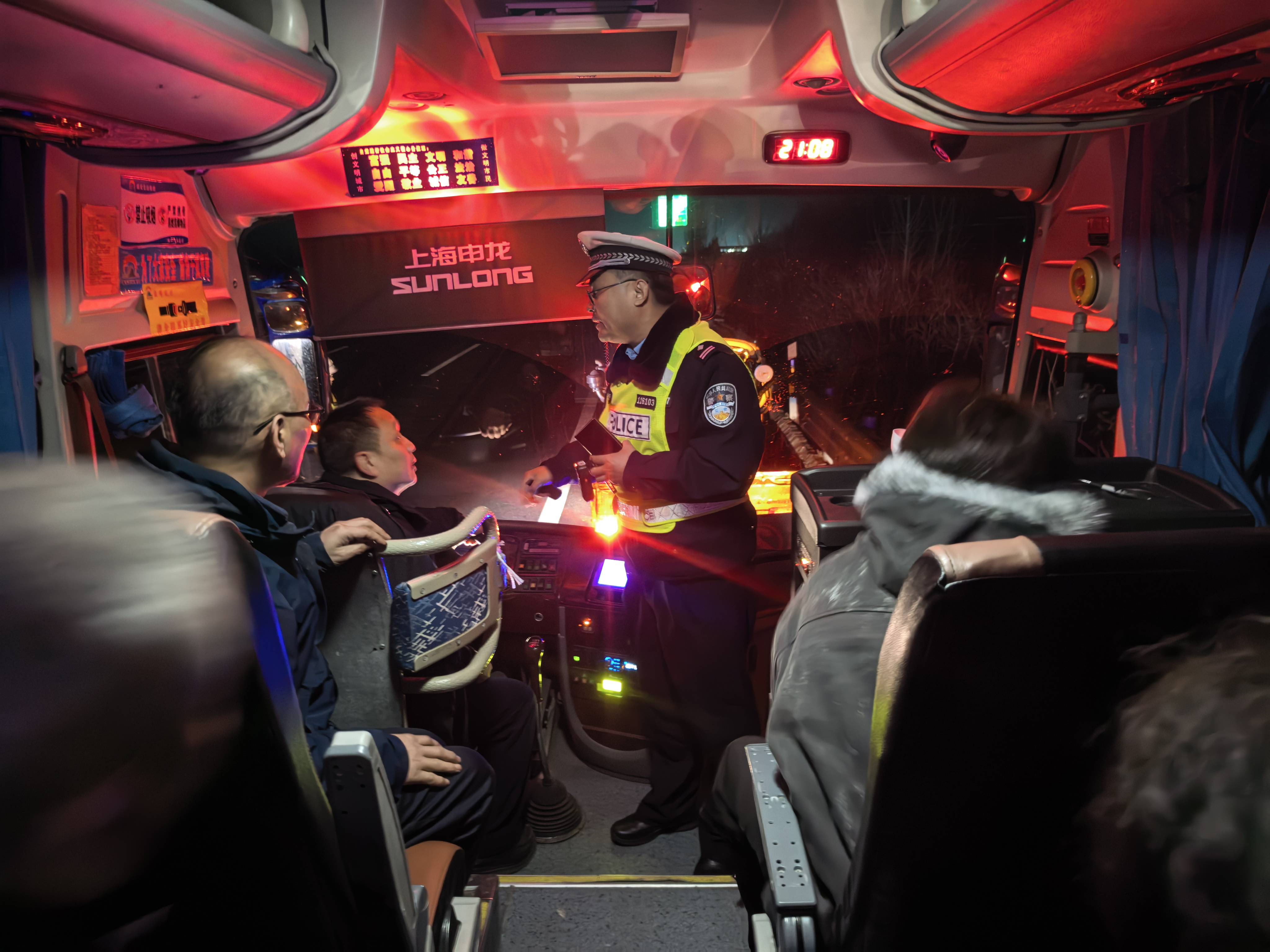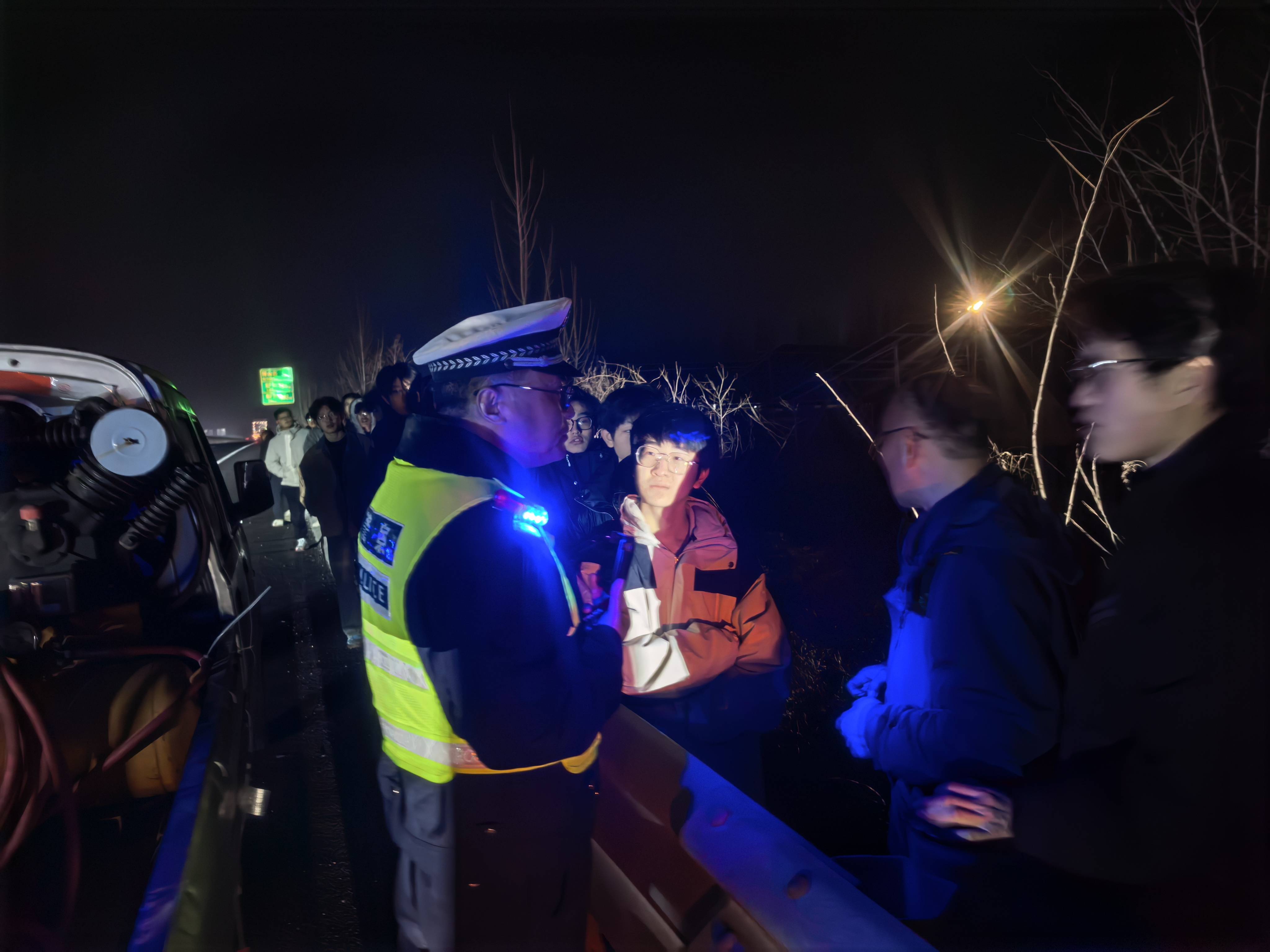 警情就是命令。执勤民警立即拉响警笛,全速赶往现场。途中,民警通过指挥中心同步提醒驾乘人员做好安全防护,切勿在行车道内逗留,严防发生二次事故。抵达现场后,民警发现事发路段为隧道群区域,夜间视线不佳、车流量较大,加之车上人员较多、有学生身体不适,现场安全风险较高。