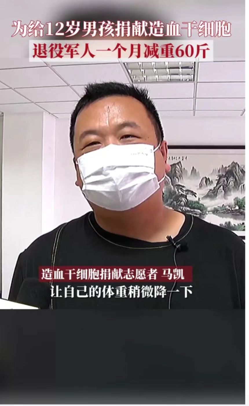 8月16日,山东青岛,为给12岁男孩捐献造血干细胞救命,退役军人马凯用强大的毅力,一个月的时间把体重从260斤减到200斤,顺利完成捐献……