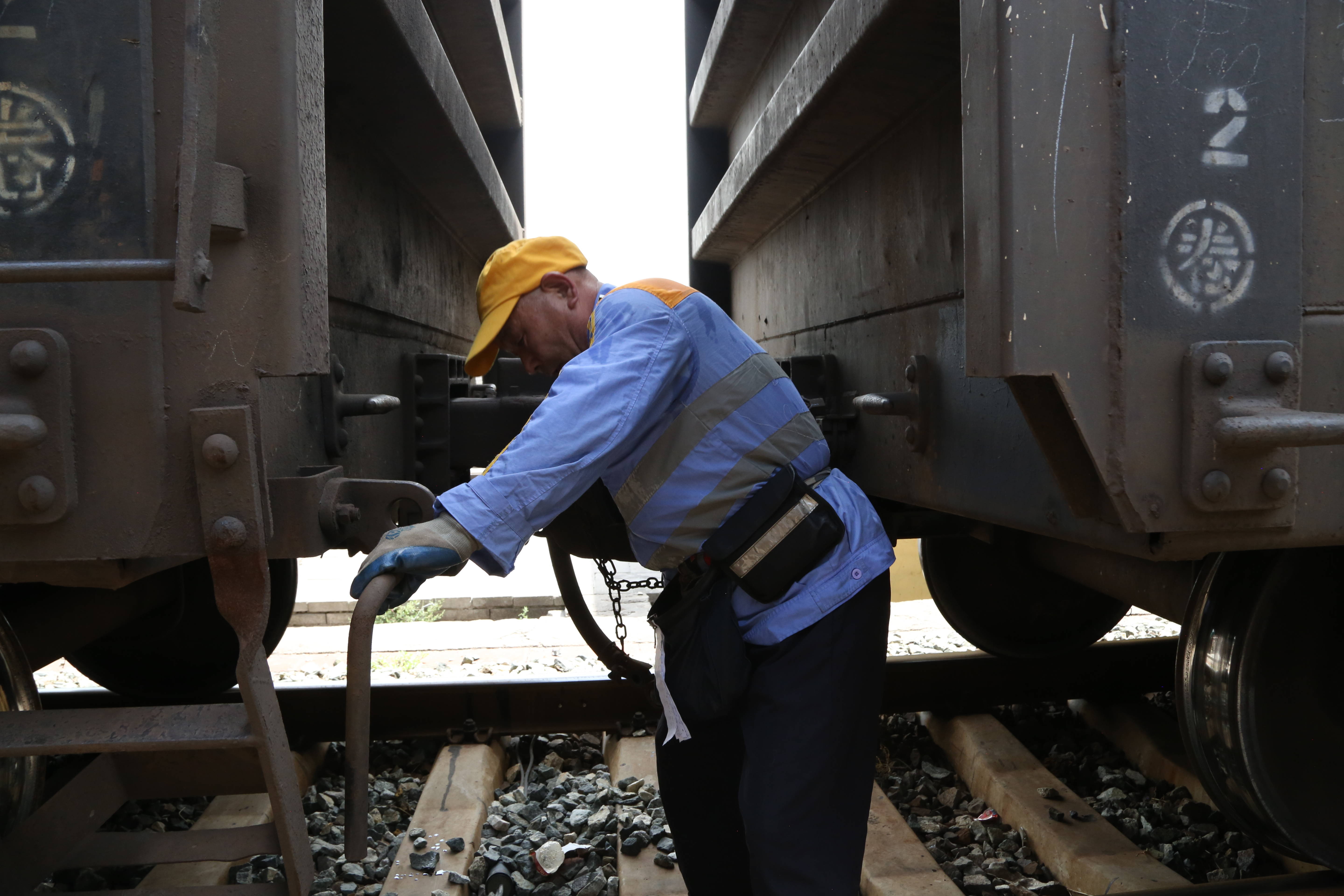 接近正午气温直逼39℃,烈日的炙烤下,车皮、钢轨被晒得滚烫,不断向外散发着滚滚的热浪,两旁的车列围得像条“铁胡同”,闷热的空气让人感觉呼吸不畅,路安强和拉风员张翔在间距不到4米的车列间穿行,就像是走在一个大烤箱里。