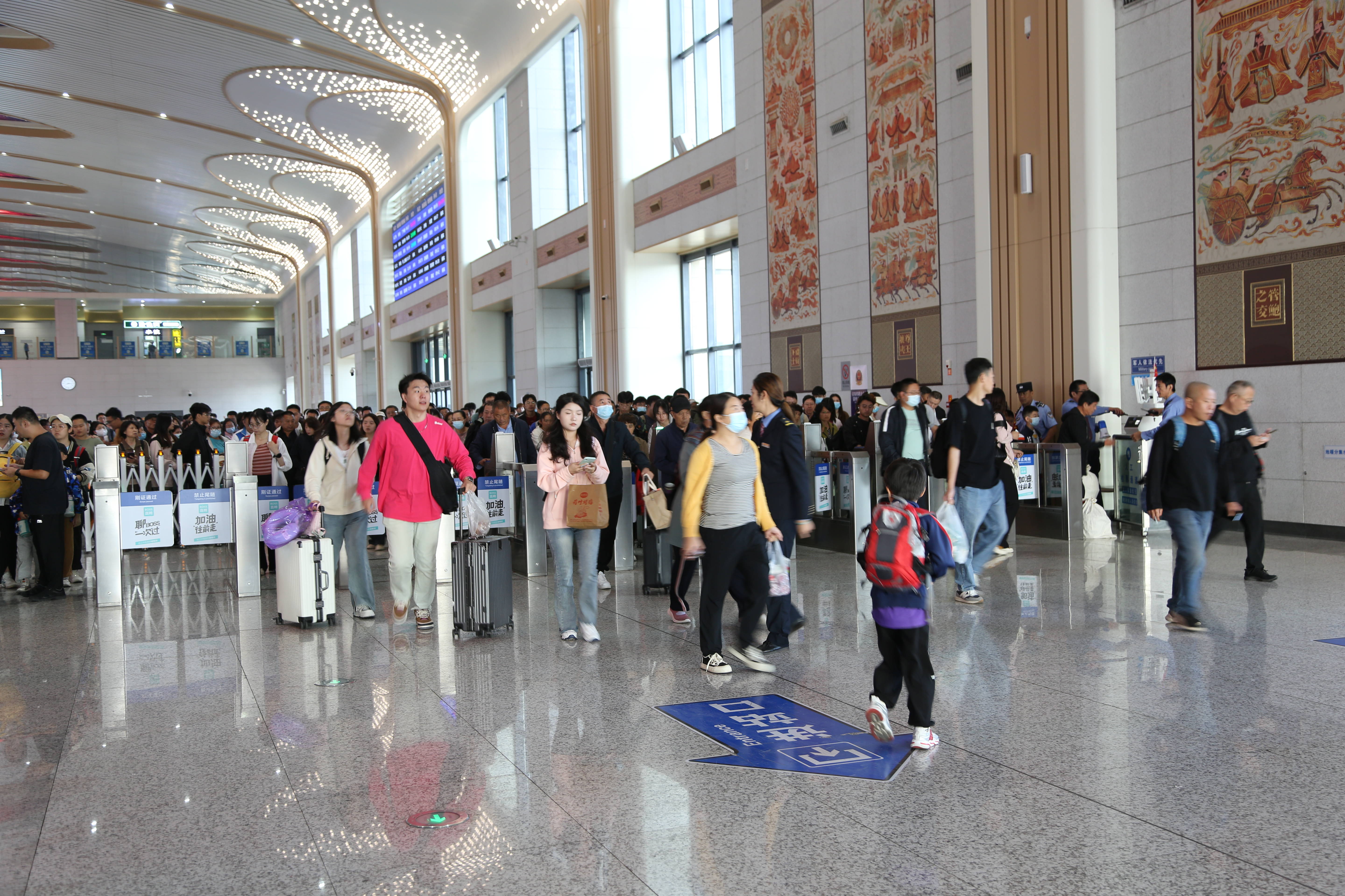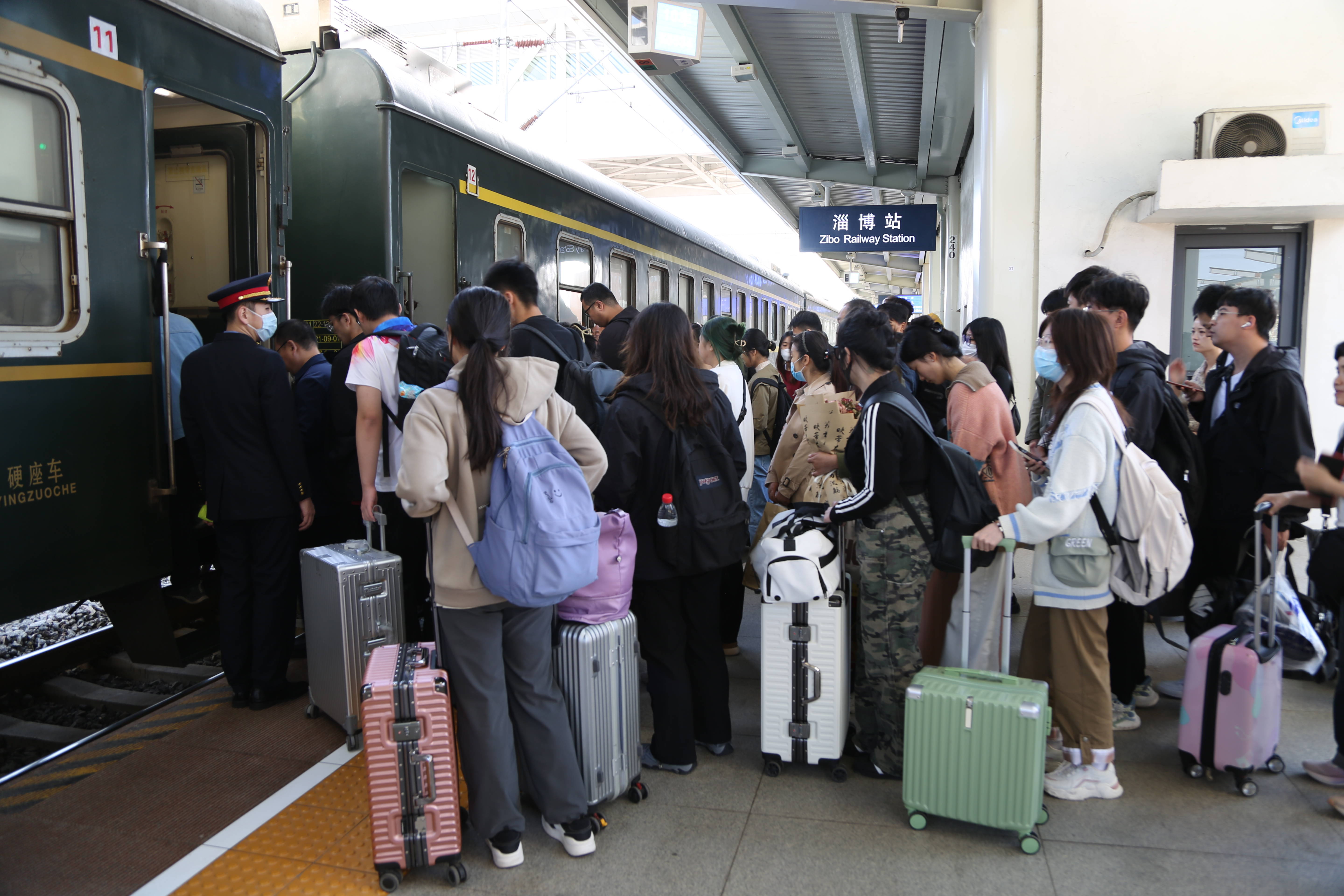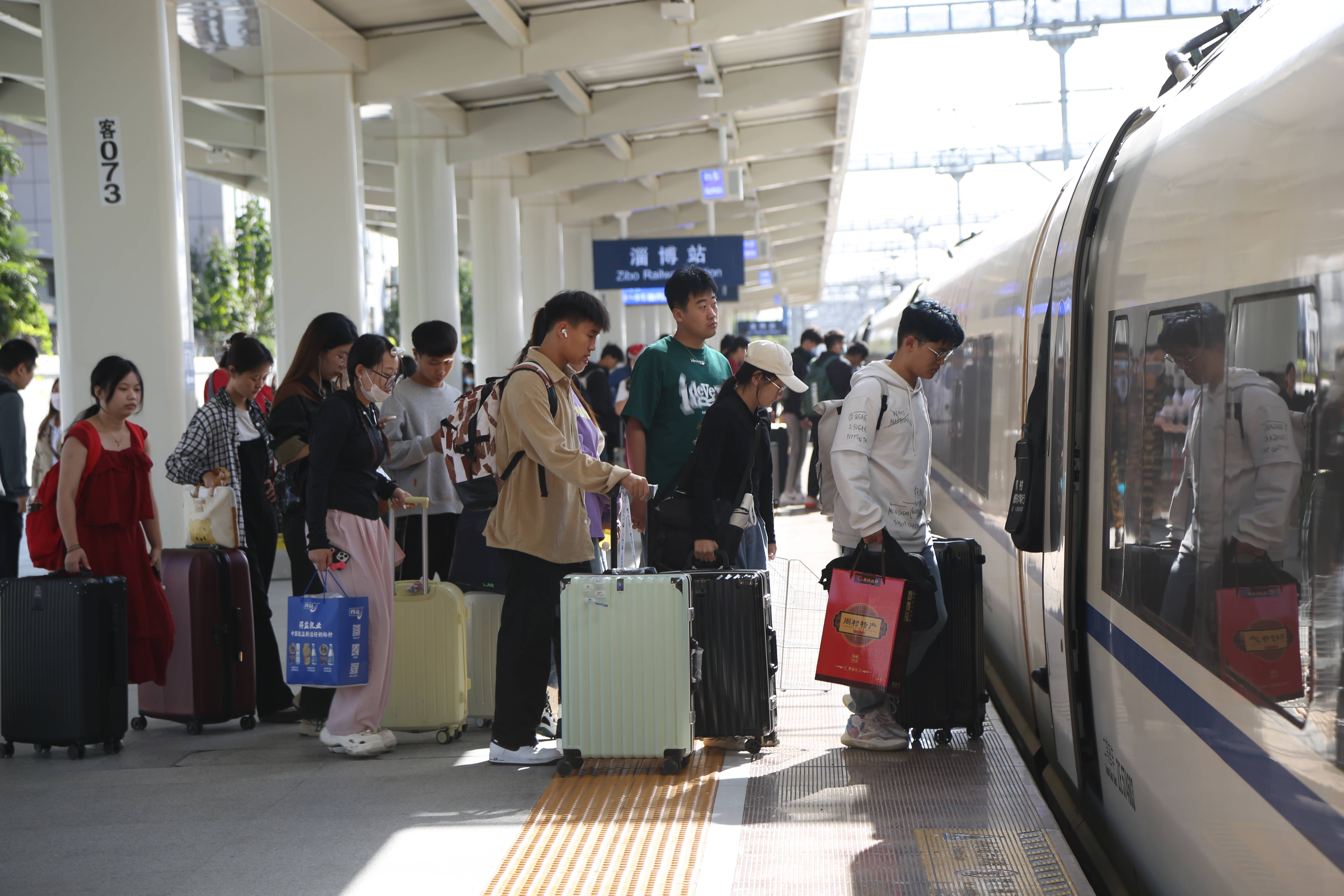 中秋国庆假期,淄博站客流持续高位运行,客流成份主要为探亲、旅游客流,以省内及中短途直通客流为主。车站加开去往青岛、济南、烟台等热门方向列车,并通过列车重联、加挂等方式增加运力,满足旅客的出行需求,假期共计开行列车1243个班次。