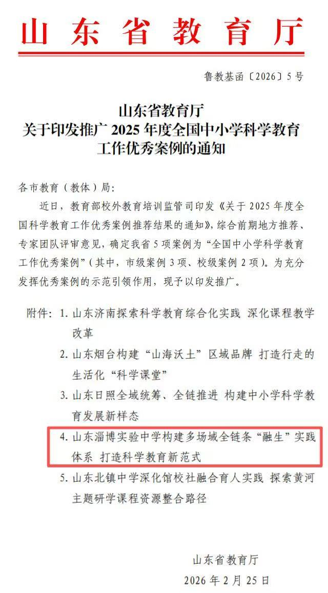近日,教育部印发《关于2025年度全国科学教育工作优秀案例推荐结果的通知》,确定我省5项案例为“全国中小学科学教育工作优秀案例”,我市《山东淄博实验中学构建多场域全链条“融生”实践体系 打造科学教育新范式》位列其中,获山东省教育厅印发推广。