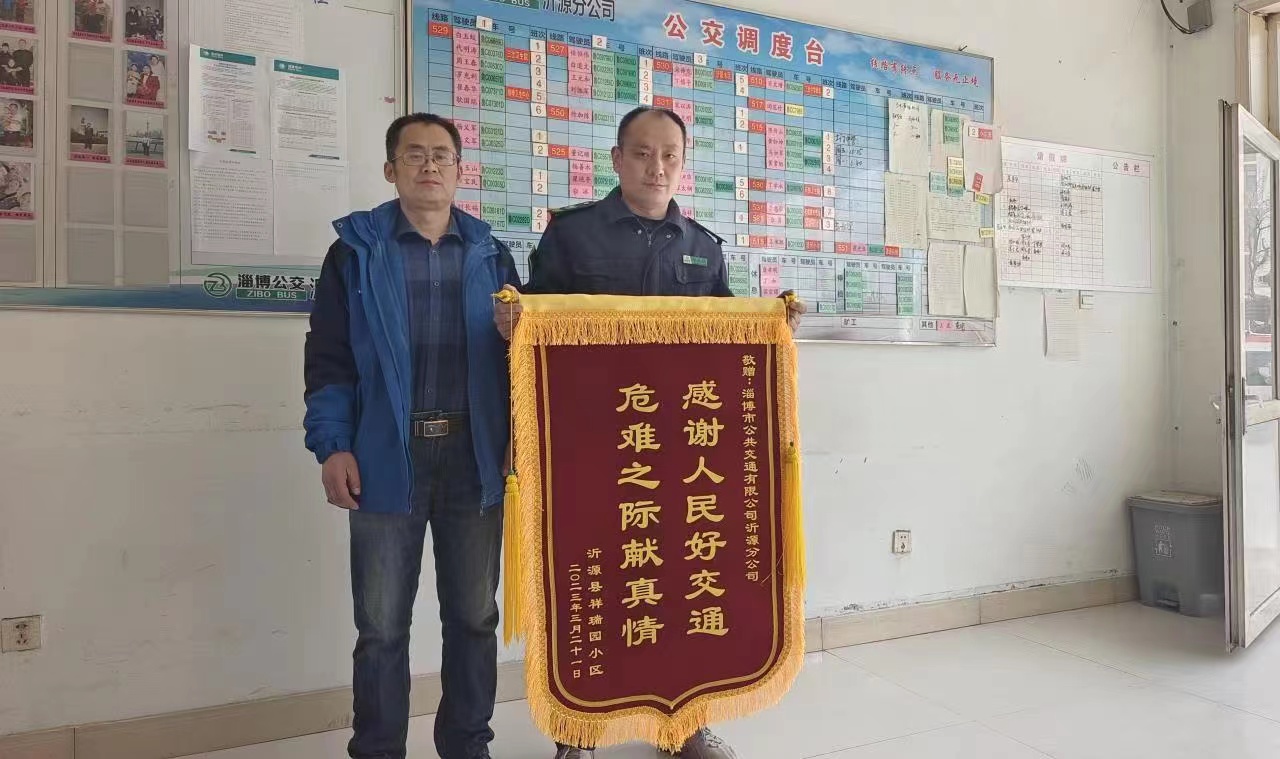 3月22日上午,沂源县祥瑞园小区业主将一面“感谢人民好交通,危难之际献真情”的锦旗送到淄博公交沂源分公司529路车长崔春华手中,感谢他奋不顾身的救火善举。
