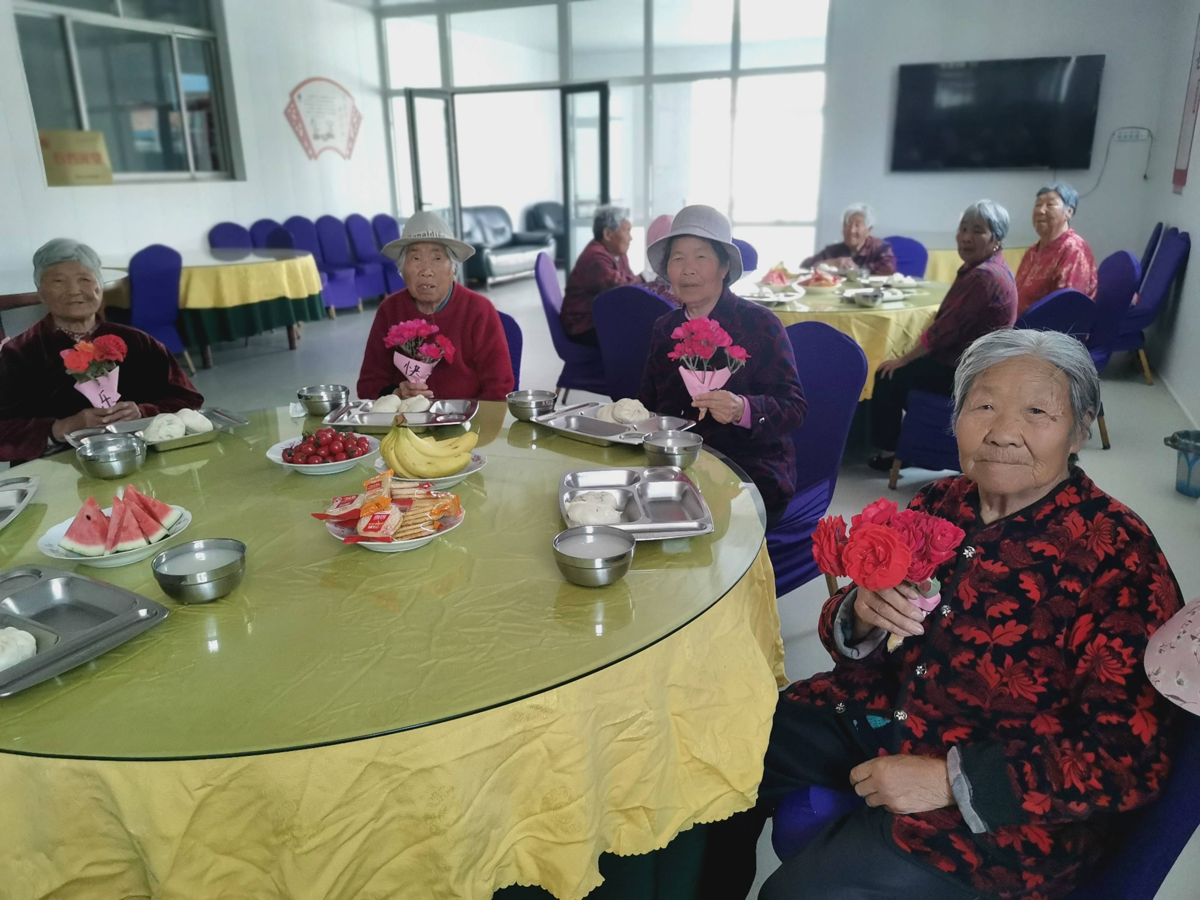 11点食堂准时开饭,志愿者们将一盘盘新鲜的水果和热乎乎的大包子端上餐桌,老人们陆续走进食堂就餐,手持精美的鲜花,吃着松软可口的包子,老人们的脸上露出如花般的笑容。此刻,耀眼的是鲜花,更耀眼的是老人们的笑容。