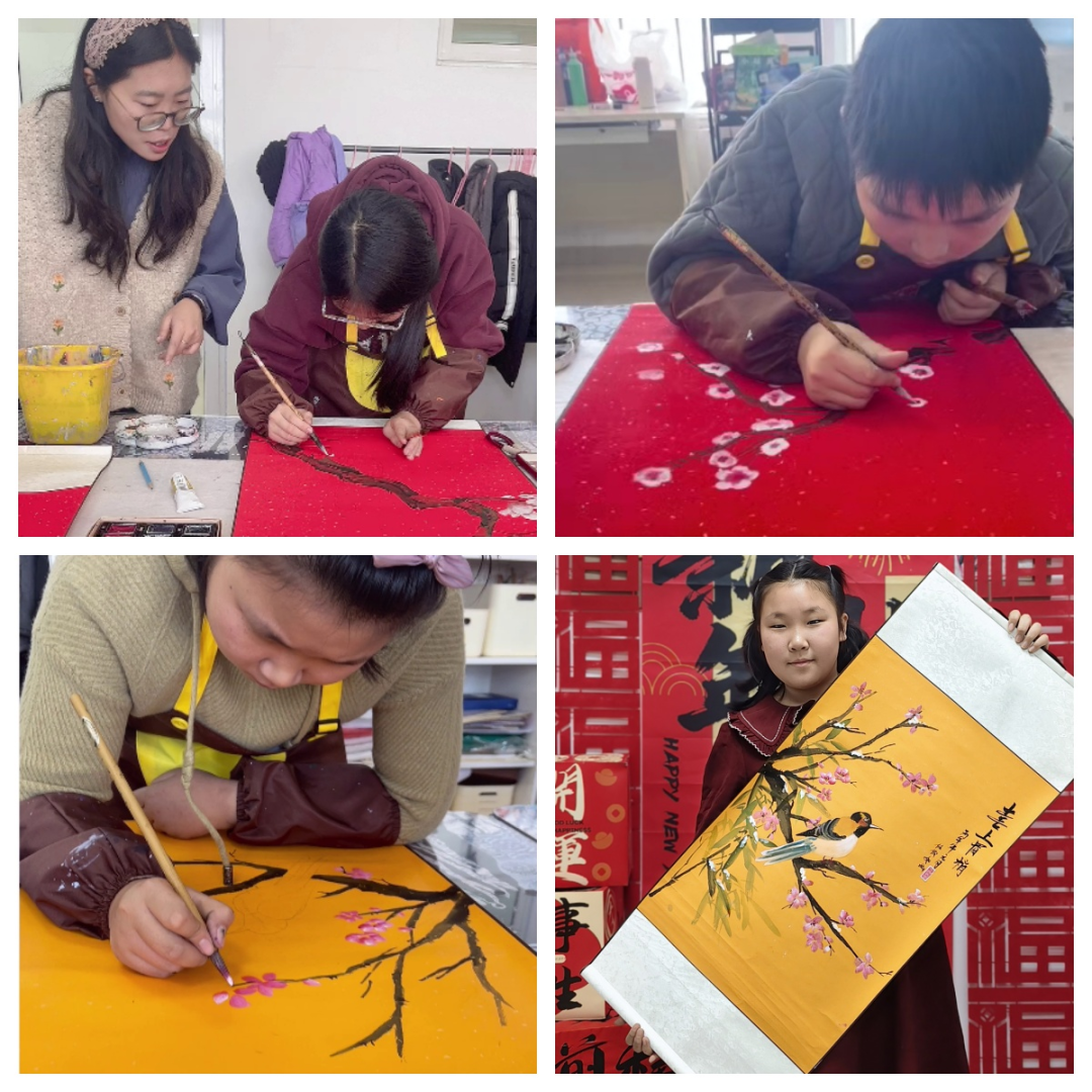 除了醒狮与福字,梅花与“喜上眉梢”主题创作亦为活动增色不少。老师围绕梅花的文化寓意,细致讲解枝干勾勒、花瓣晕染的技巧,同时指导大家掌握喜鹊与梅花的搭配构图,助力大家精准捕捉“喜上眉梢”的灵动意境。小朋友们笔下的梅花盛放热烈、傲骨天成,喜鹊憨态可掬、灵动鲜活,一幅幅佳作接连诞生,将对新春的美好期许藏于笔墨之间,尽显传统吉祥意象的独特韵味。
