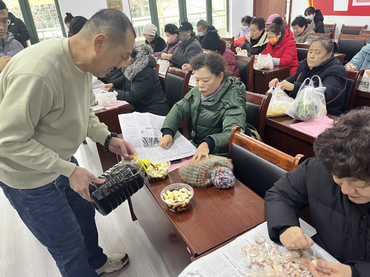 除了翰墨书香,活动现场另一角则弥漫着生活气息与食材的清香——社区居民正在志愿者的引导下,共同体验腌制腊八蒜的传统手艺。大家围坐在一起,将一颗颗饱满的蒜瓣去皮、洗净、晾干,然后小心翼翼地装入洁净的塑料碗中,再缓缓倒入准备好的米醋,密封保存。过程中,有经验的居民热心地分享着腌制技巧和自家配方,年轻人则好奇地询问着腊八蒜的由来与寓意。一罐罐碧绿初现的腊八蒜,不仅承载着“腊月忙年”的民俗记忆,更在邻里协作、经验分享中酿出了浓浓的社区情谊,让传统民俗在亲手实践中变得可感、可亲。