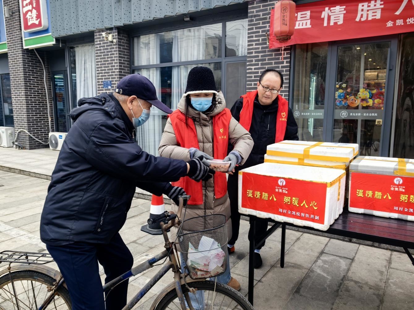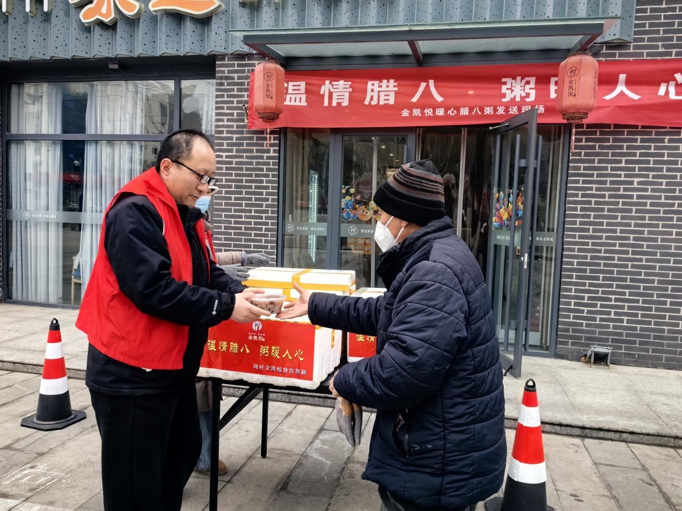 活动现场,粥香袅袅、暖意融融。社区工作人员与金凯悦的志愿者们早已提前备妥食材,将糯米、红豆、红枣等谷物精心熬煮数小时,让每一碗粥都软糯香甜、营养充足。清晨的游客中心前,领粥队伍有序排起,志愿者们身着志愿服装,有条不紊地为辖区60岁以上老人、坚守岗位的环卫工人分装腊八粥,一句句“腊八节快乐”“趁热喝”的温馨叮嘱,伴着浓郁粥香萦绕在现场每个角落。