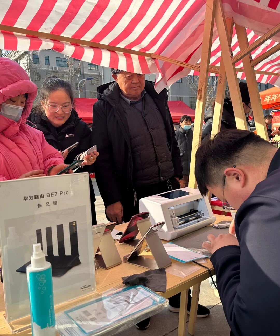 除年货展销外,现场特别设立了便民服务专区,将暖心关怀融入生活日常:手艺娴熟的贴膜师傅现场为居民保养手机屏幕;银行工作人员结合真实案例,生动讲解防范非法集资与电信诈骗的实用技巧。每一项服务都立足居民实际需求,体现了社区办实事、送温暖的贴心之举。