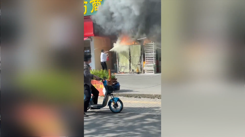 由于起火房屋地处风口,火势蔓延很快,宗树蓬、刘康两人各拿一个灭火器,跑步来到现场扑救,同时告知旁边店员,拨打119求援。
