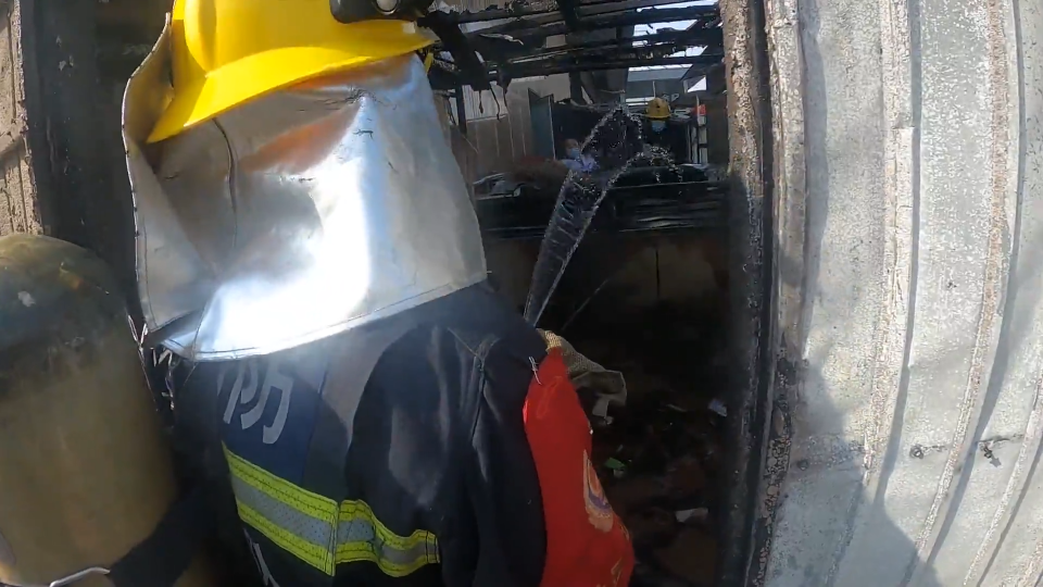 淄博公交张店分公司安检员 刘康:烟越来越大,我们用灭火器对准了那铁皮屋子的下沿,对火势进行压制。