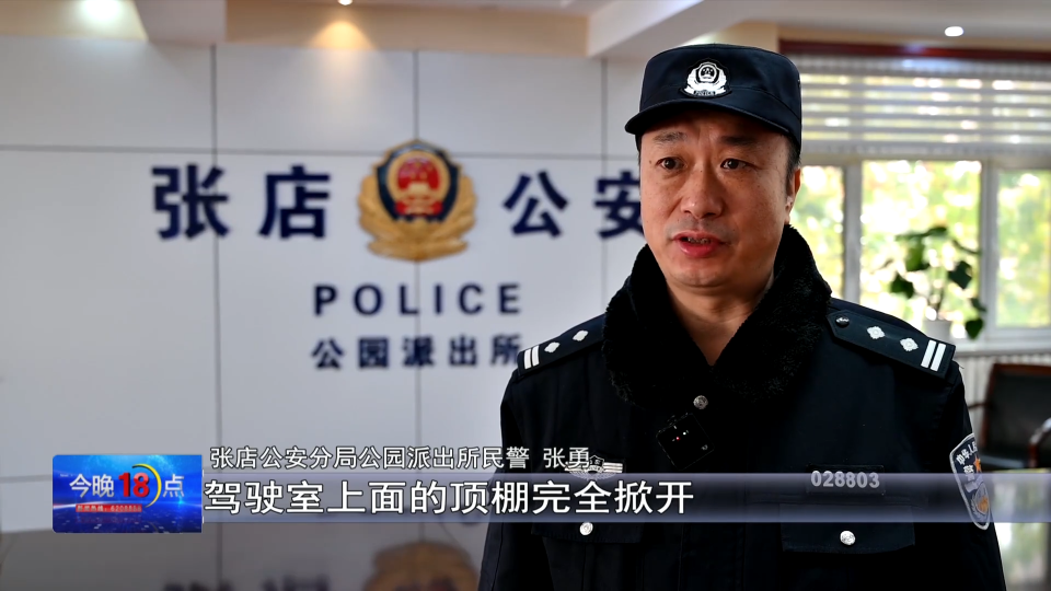 张店公安分局公园派出所民警 张勇:驾驶室上面的顶棚完全掀开,驾驶位上坐着一名年轻女子,当时这名年轻女子应该是陷入了半昏迷状态。