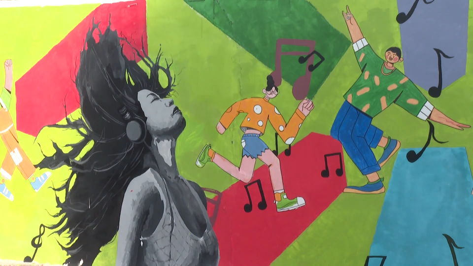 淄博职业学院学生 马海云:这面墙感觉被这个一面墙的一个色彩给感染住了,非常具有艺术特色,也是为咱们那个南街感觉做了一个非常好的一个打卡点。
