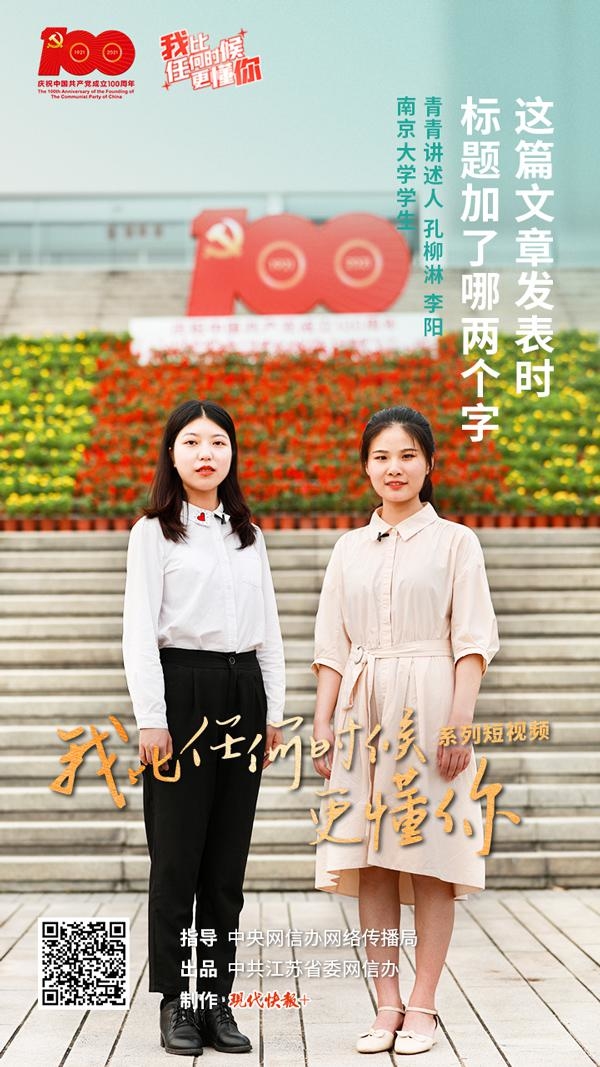 8 月 18 日," 我比任何时候更懂你 " 系列短视频第 25 集《这篇文章发表时标题加了哪两个字?》上线,本集青青讲述人是南京大学学生孔柳淋、李阳,两人都是马克思主义学院的学生。