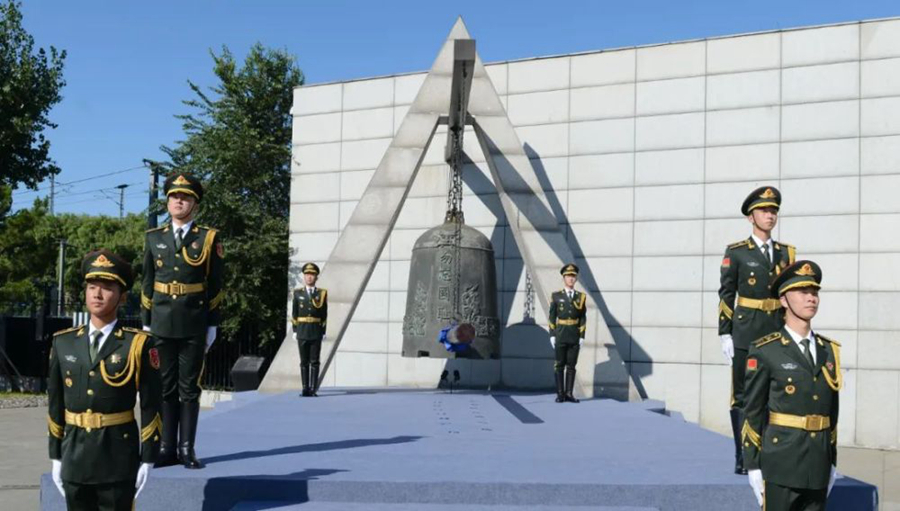 参观者经过沈阳九一八历史博物馆内的《义勇军进行曲》浮雕墙。新华社记者李钢摄