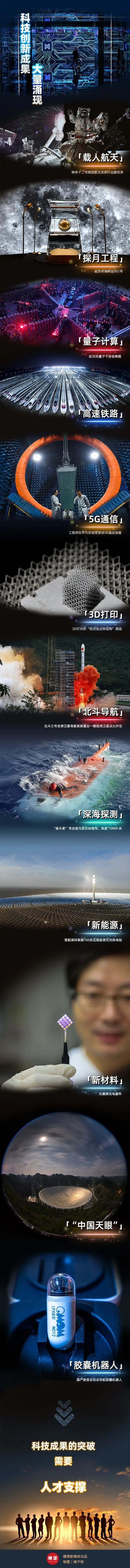 人才队伍快速壮大,人才创新活力竞相迸发,人才红利加速释放,科技创新成果大量涌现。载人航天、探月工程、深潜探测、量子通信等一批具有国际影响的高水平成果举世瞩目。“中国天眼”落成启动,北斗导航组网运行,川藏铁路开工建设,3D打印、基因测序、新材料、新能源等产业化步伐加快,高速铁路、超级计算机、5G通信、高温气冷堆等高端装备研发制造连续取得重大突破,一些前沿领域开始进入并跑、领跑阶段,我国在全球创新版图中的位势节节攀升。