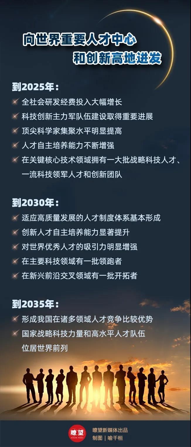到2025年,全社会研发经费投入大幅增长,科技创新主力军队伍建设取得重要进展,顶尖科学家集聚水平明显提高,人才自主培养能力不断增强,在关键核心技术领域拥有一大批战略科技人才、一流科技领军人才和创新团队;到2030年,适应高质量发展的人才制度体系基本形成,创新人才自主培养能力显著提升,对世界优秀人才的吸引力明显增强,在主要科技领域有一批领跑者,在新兴前沿交叉领域有一批开拓者;到2035年,形成我国在诸多领域人才竞争比较优势,国家战略科技力量和高水平人才队伍位居世界前列。