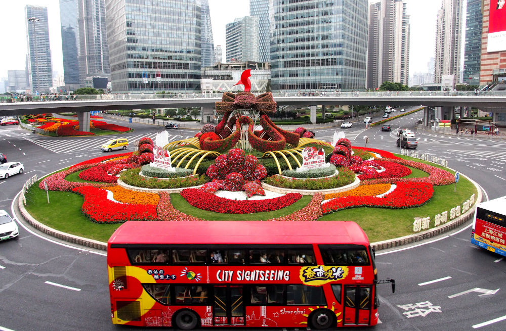 ↑2020年11月1日,一辆巴士经过上海浦东陆家嘴环岛。