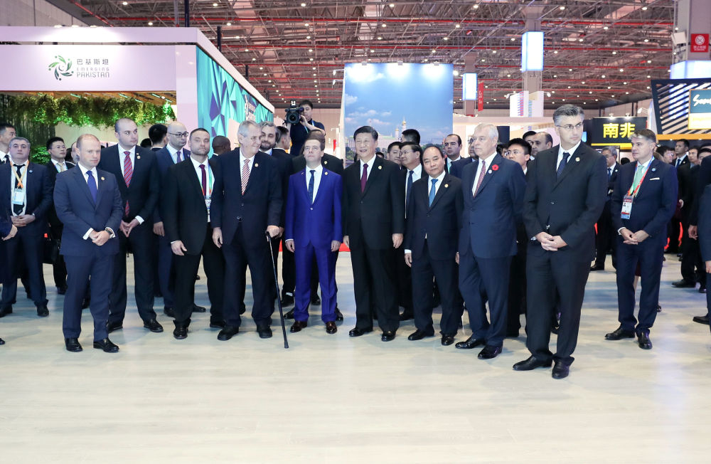 ↑2018年11月5日,习近平在上海同出席首届中国国际进口博览会的外国领导人共同巡馆。
