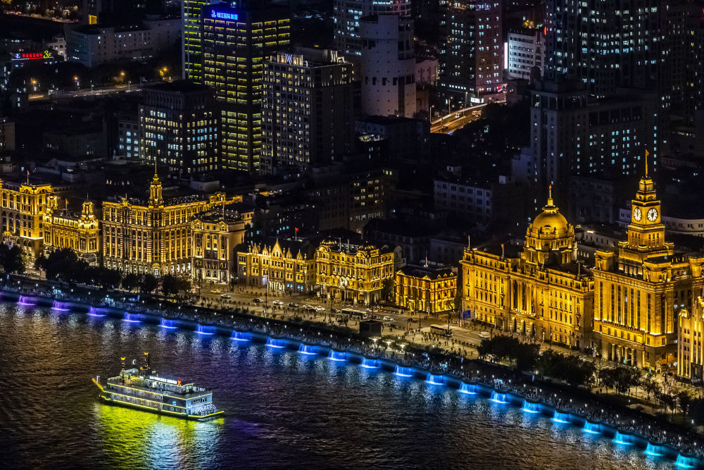 ↑2018年11月2日,游船经过上海外滩建筑群。