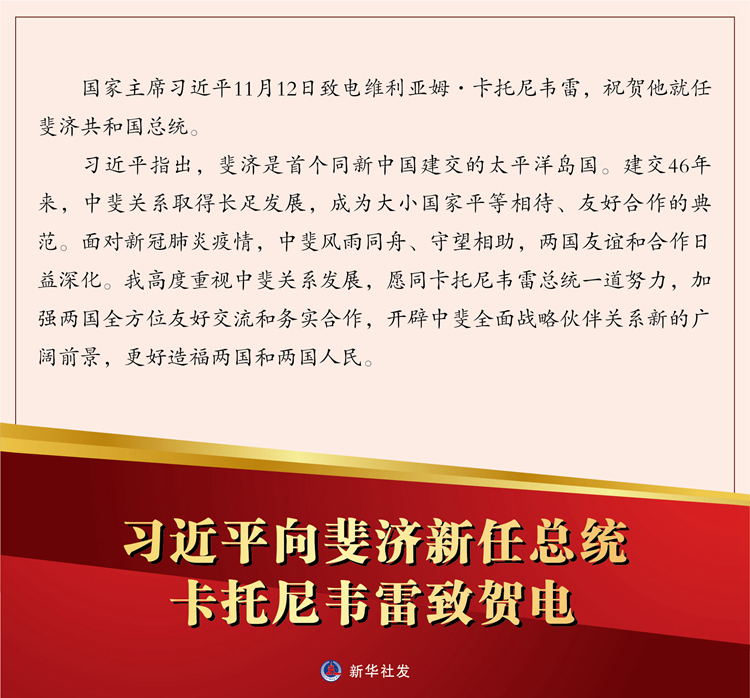 国家主席习近平11月12日致电维利亚姆·卡托尼韦雷,祝贺他就任斐济共和国总统。