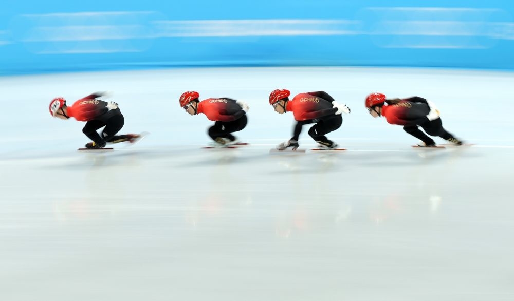 2月1日,中国短道速滑队选手在训练中。新华社记者曹灿摄