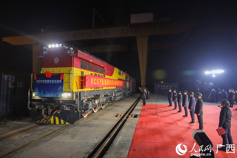 RCEP生效后首趟国际货运班列从广西南宁启程。人民网 吴明江摄