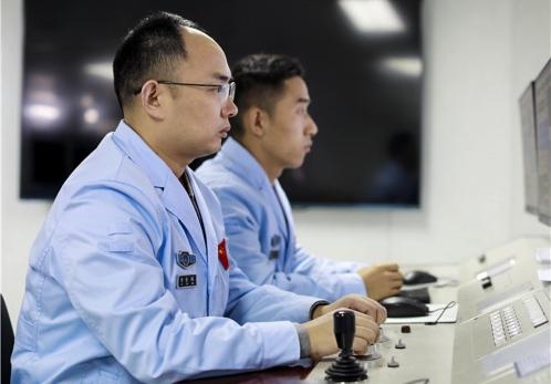 雷达控制室内,身穿蓝色航天工作服的主操作手胡金辉和所有参试人员全神贯注,紧紧盯着雷达荧幕,第一时间发现并成功捕获目标。参试各系统严密组织,系统之间相互配合密切,确保各项进程有条不紊地进行。