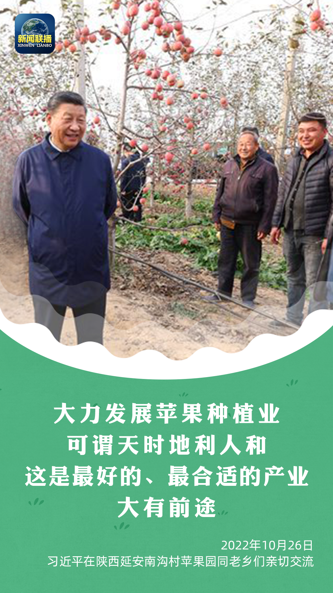 考察当天,得知南沟村滴灌技术、矮化种植技术等不断发展,而且苹果不愁销路,总书记高兴地说:“大力发展苹果种植业可谓天时地利人和,这是最好的、最合适的产业,大有前途。”
