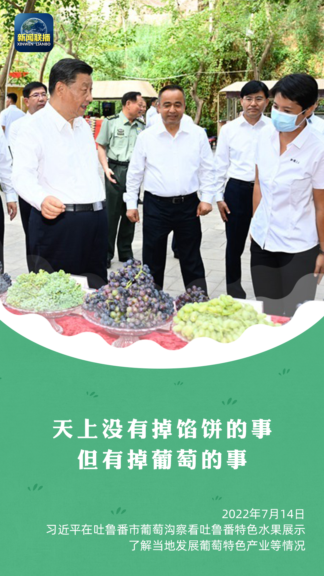 “多么富饶的一个地方,瓜果飘香。这是大自然的馈赠。”总书记风趣地说,“天上没有掉馅饼的事,但有掉葡萄的事。”总书记还强调,要推动文化和旅游融合发展,打造富民产业。