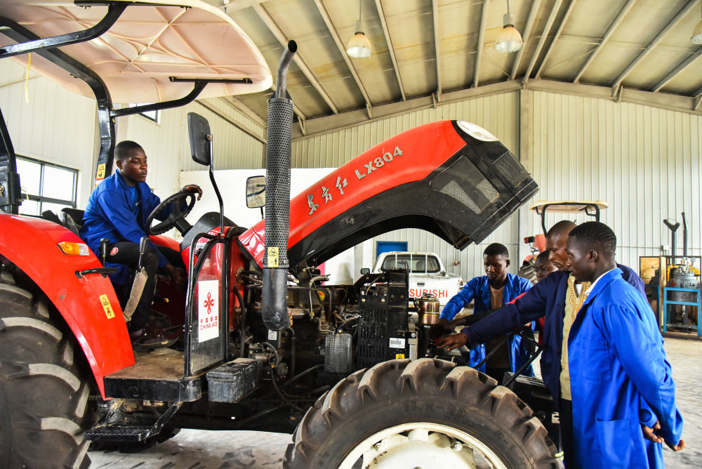 中方援建的喀麦隆亚巴西农业职业技术中学里,学生们在上拖拉机实践课。