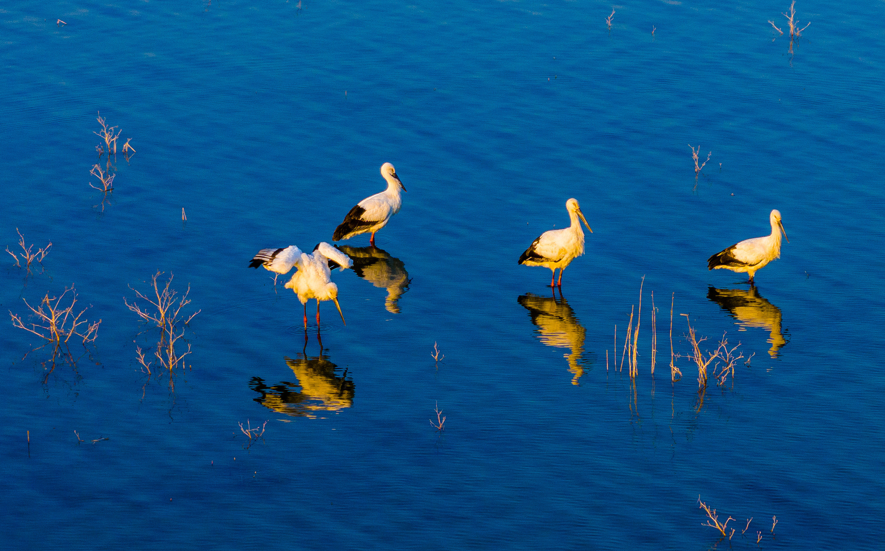 △ 2023年12月1日,安徽淮北,烈山区化家湖,4只迁徙的国宝级野生动物东方白鹳在休憩、觅食。