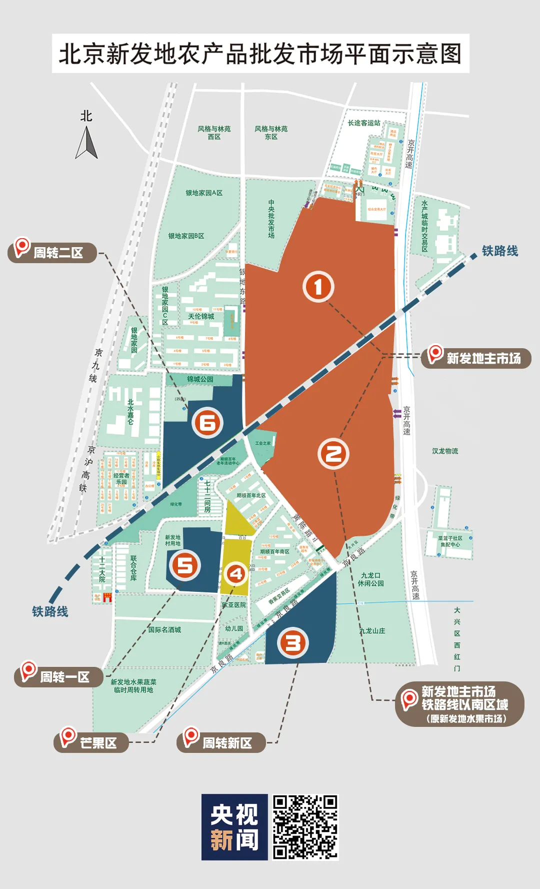 新发地批发市场包括1485亩的主市场,一条铁路线从中间横穿。还有主市场西侧和西南边的4个果蔬批发经营区,由南向北分别是:周转新区、芒果区、周转一区和周转二区,面积为421亩。
