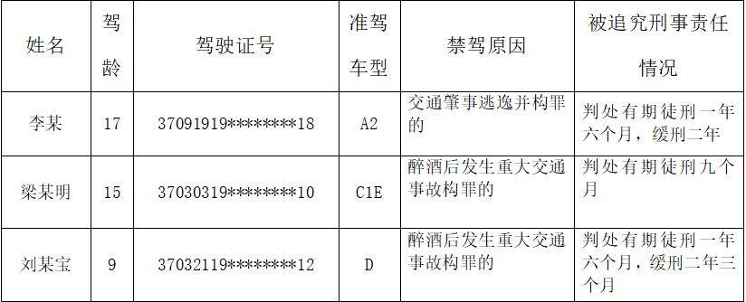 3名终生禁驾人员,梁某明、刘某宝因醉酒后发生重大交通事故构罪,李某因交通肇事逃逸并构罪被终生禁驾。