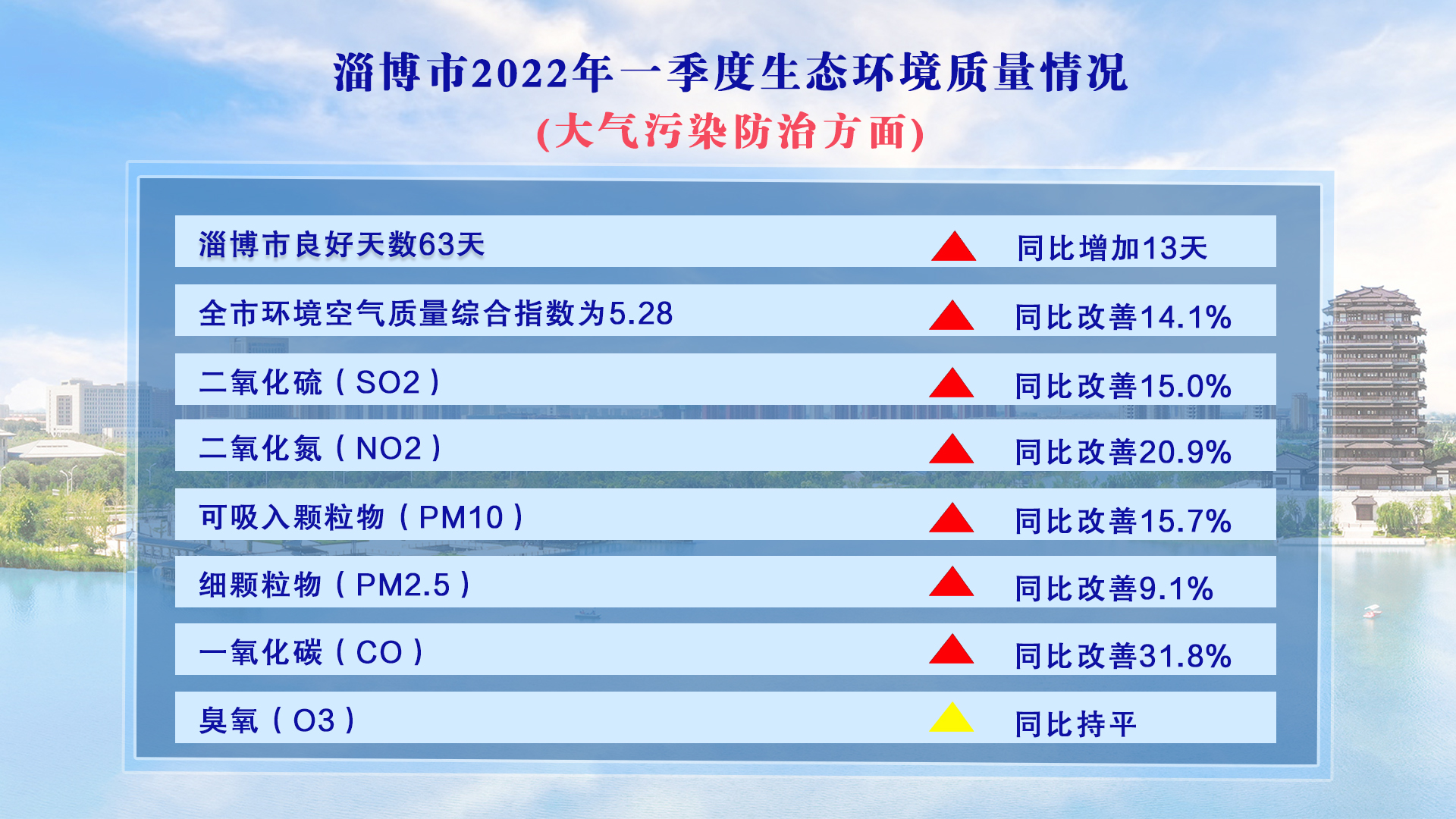 在大气污染防治方面,1-3月份,淄博市良好天数63天(国控),同比增加13天,改善率全省排名第5位。全市环境空气质量综合指数为5.28,同比改善14.1%,改善率全省排名第6位。其中,二氧化硫(SO2)同比改善15.0%;二氧化氮(NO2)同比改善20.9%;可吸入颗粒物(PM10)同比改善15.7%;细颗粒物(PM2.5)同比改善9.1%;一氧化碳(CO)同比改善31.8%;臭氧(O3)同比持平,改善率全省排名第6位。