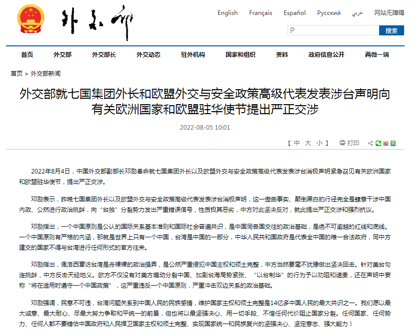 2022年8月4日,中国外交部副部长邓励奉命就七国集团外长以及欧盟外交与安全政策高级代表发表涉台消极声明紧急召见有关欧洲国家和欧盟驻华使节,提出严正交涉。