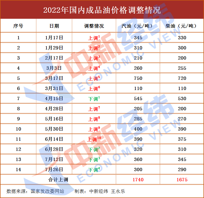 据中新经纬统计,2022年国内成品油价格已经历14轮调整。汽油价格总计上调1740元/吨,柴油价格总计上调1675元/吨,呈现“十涨四跌零搁浅”格局。如果此次价格下调落实,2022年成品油调价将呈现“十涨五跌零搁浅”的格局,同时将成为自2019年来首个“四连跌”。在此之前,成品油调价于2018年以“五连跌收官”。