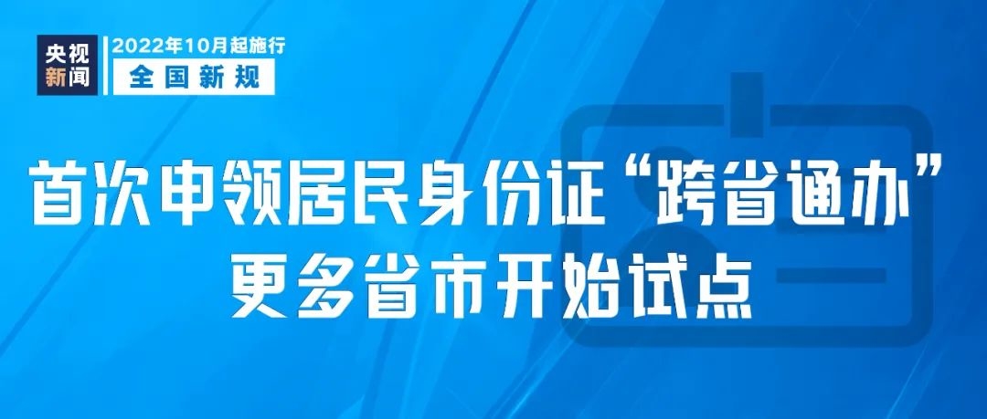 根据公安部制定印发的2022年服务经济社会发展助力稳住经济大盘重点措施,2022年8月1日起,在长三角、闽赣、川渝黔三个片区的9省市全面推开区域内首次申领居民身份证“跨省通办”。10月1日起,在全国其他省市逐步启动试点工作。