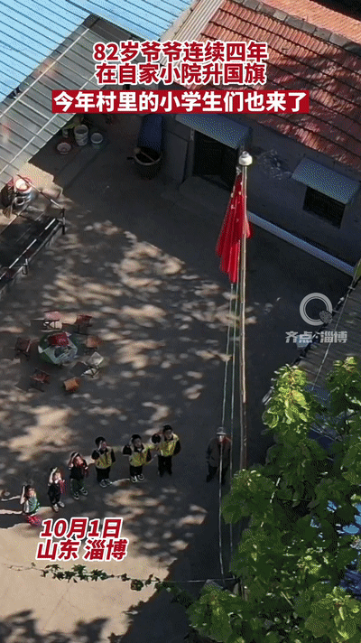 国庆节当天 八旬爷爷在自家小院升起国旗