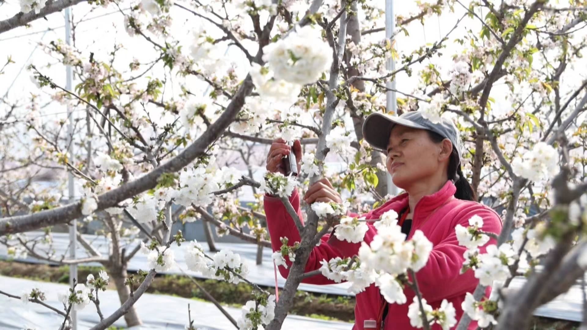 早春时节,各地农民抢抓农时积极展开春耕春管工作,田间地头一派繁忙的劳动景象,各种科技手段也让春耕春管更智慧。在高青县芦湖街道芦湖村的樱桃棚内,成片的樱桃花已经竞相绽放,一团团、一簇簇的樱桃花宛如白雪,花香扑鼻而来。俗话说,樱桃好吃树难栽。和其他水果相比,樱桃栽植在温度、湿度等方面难度更大,而现在她已经告别了“靠天吃饭”的状况,大棚的温度、湿度、通风都被实时监控,自动卷帘机、自动防风系统轮番上阵。高青县芦湖街道大芦樱桃示范园的负责人卢小云说:“大棚里可以设定温度、温度等,樱桃的花期可以人为控制,产量和品质也提高了”。