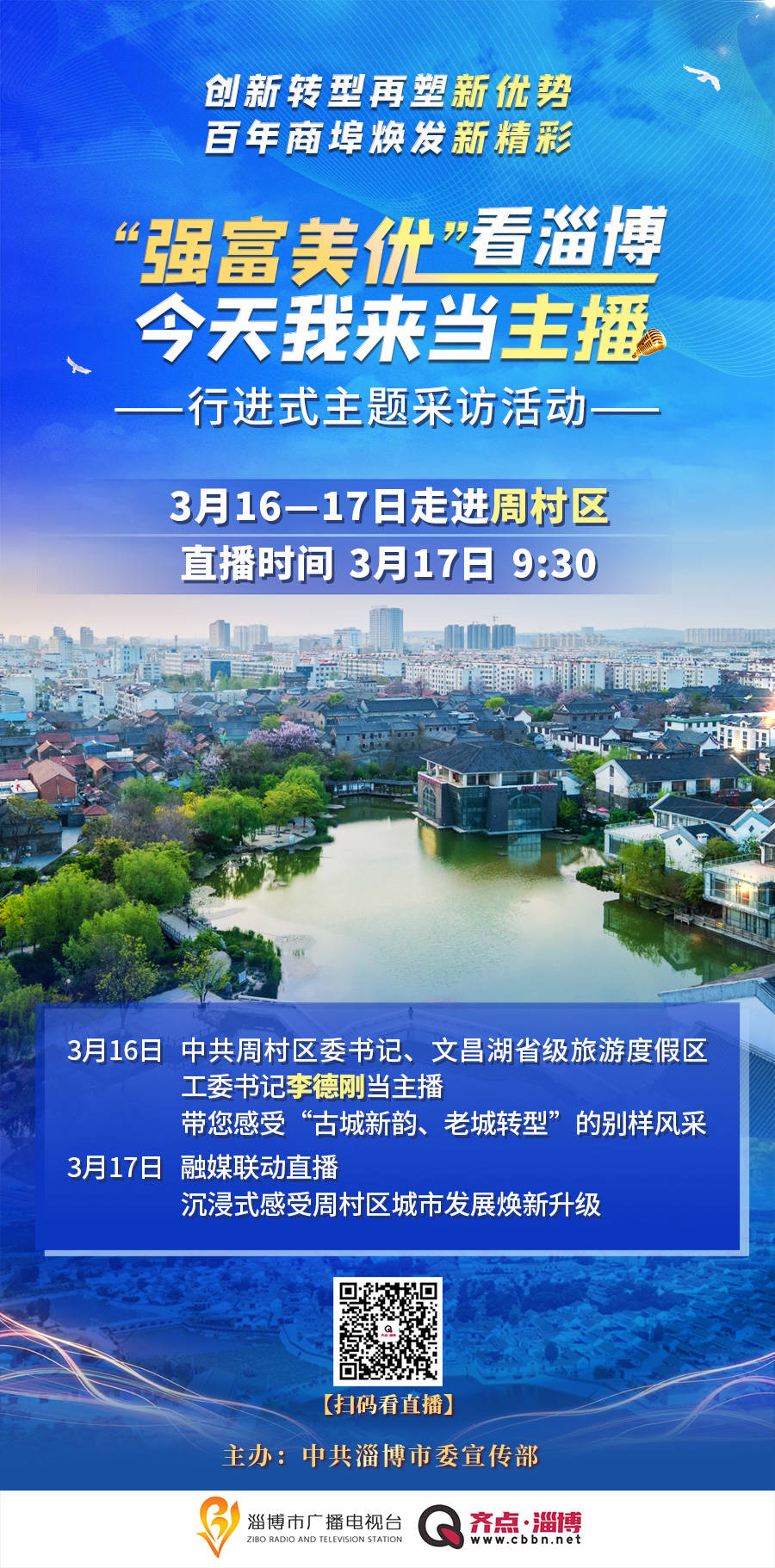 3月17日,融媒联动现场直播,演播室主持人与前方记者跨空间联通互动,打卡淄博大染坊丝绸集团有限公司、淄博晶优光伏科技有限公司淄博基地、天香公园、文昌湖省级旅游度假区,沉浸式感受周村区城市发展焕新升级。