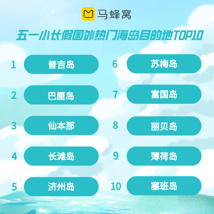 出境游热门目的地方面,携程数据显示,今年“五一”假期内地出境机票预订量前十大目的地分别为中国香港、曼谷、新加坡、首尔、普吉岛、中国台北、中国澳门、吉隆坡、东京、大阪。而在同程旅行平台上,曼谷、新加坡、中国澳门、普吉岛和巴厘岛的人气居前。其中,新加坡、马尔代夫和泰国的“五一”假期旅游订单量环比增长超过7倍。据马蜂窝大数据显示,在或传统或新奇的出境玩法中,海岛度假以绝对优势成为年轻人“五一”假期的首选。