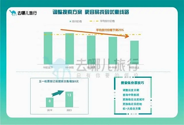 去哪儿数据统计,用户预订前平均搜索量为13次,较2019年平均增加5次,搜索比价50次以上比搜索10次以下的用户,淘到低价票的概率更高,平均支付价格低四分之一。