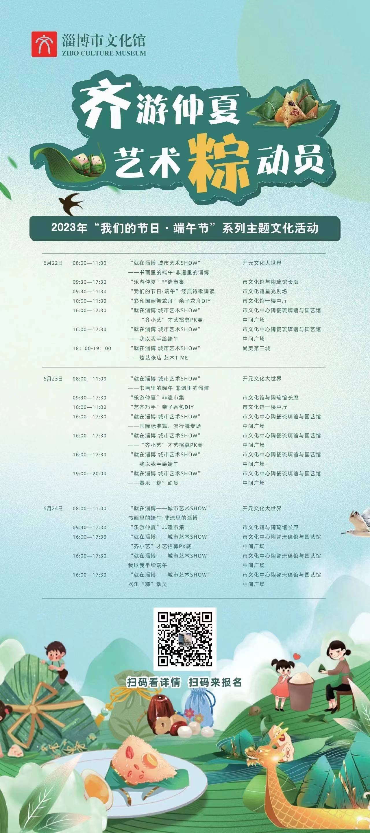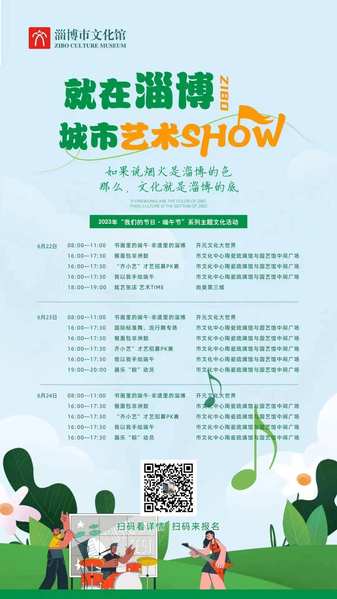 为进一步弘扬优秀传统文化,提升全市文旅内容供给,打造主客共享、人人参与的文化盛宴, 2023年端午假期第一天,淄博市文化馆发挥职能优势,创新功能维度,以搭建美好生活文化场景为基调,多点发力,策划推出一揽子艺术与城市融合的文化场景赋能行动,描绘出“就在淄博”独有的城市艺术图景。
