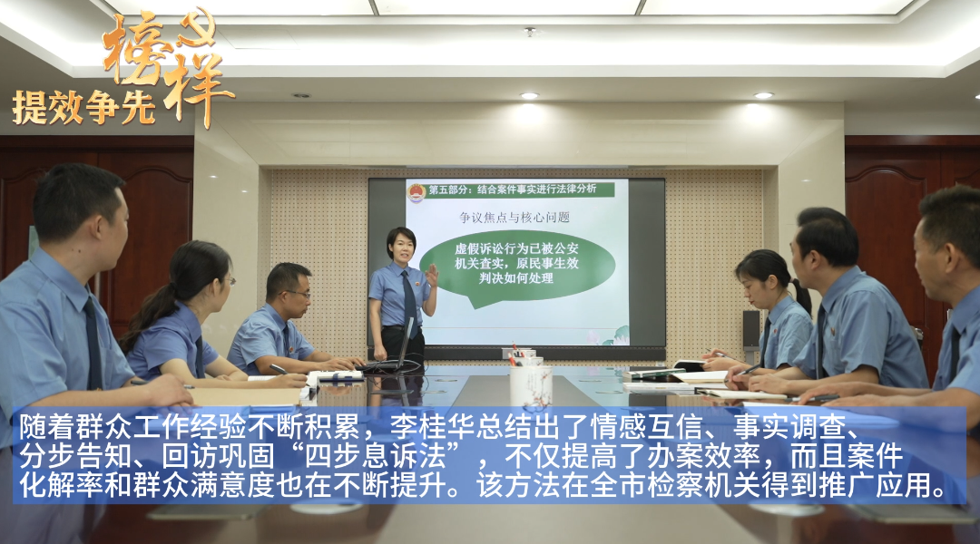 随着群众工作经验不断积累,李桂华总结出了情感互信、事实调查、分步告知、回访巩固“四步息诉法”,不仅提高了办案效率,而且案件化解率和群众满意度也在不断提升。该方法在全市检察机关得到推广应用。