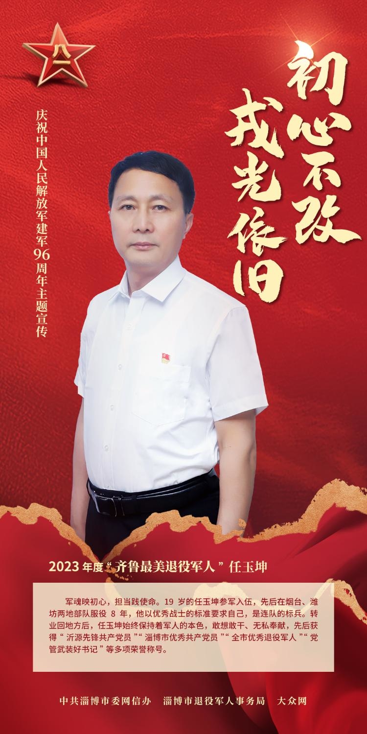 八月的风雨,流淌着激情与热血;八月的色彩,描绘着勇敢和担当。在第96个八一建军节来临之际,中共淄博市委网信办、淄博市退役军人事务局联合大众网、鲁中网2家媒体,开展“初心不改·戎光依旧”主题宣传活动。活动将围绕2023年度“齐鲁最美退役军人”任玉坤、“齐鲁最美拥军人物”刘洪增,2023年度“淄博最美退役军人”“新时代好军嫂”“新时代兵妈妈”等优秀典型进行系列报道,以激励广大退役军人弘扬人民军队光荣传统和优良作风,奋进新征程、建功新时代,营造全社会尊崇军人的浓厚氛围,推动退役军人工作高质量发展,为建设“强富美优”现代化新淄博、建成新时代社会主义现代化强市贡献力量!